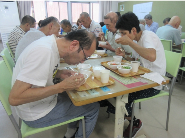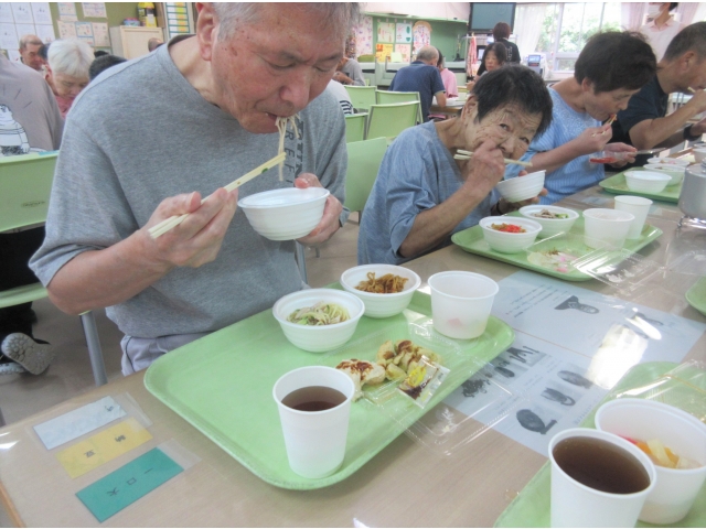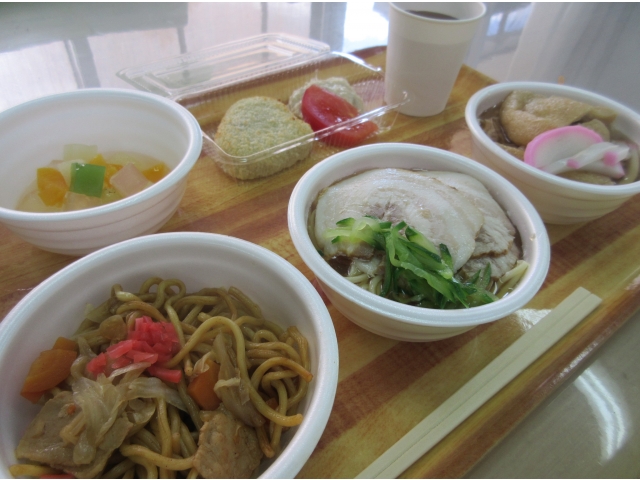焼きそば、冷やしラーメン、きつねそば、コロッケ、ツナサラダ、フルーツ寒天とボリューム大!