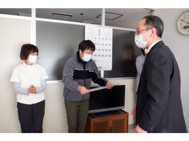 当日の式典には不参加だったので後日感謝状を届けていただき、明知寮で授与式を執り行いました。