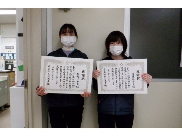 春日井市長からの感謝状は、おおむね40歳未満の次代を担う意欲のある社会福祉事業従事者ということで、2名の職員に授与されました。