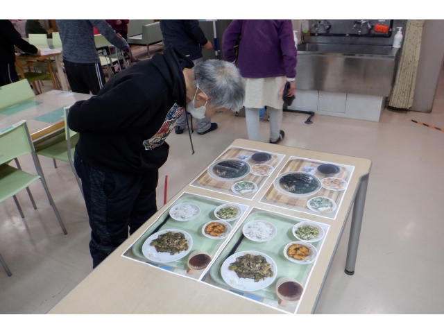 利用者様は、昨日の明知寮の食事の写真を見ながら、実際にどんな順番で食べたか思い出し、どの順番で食べたら良かったか考えました。