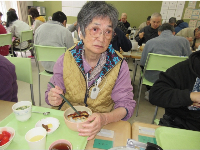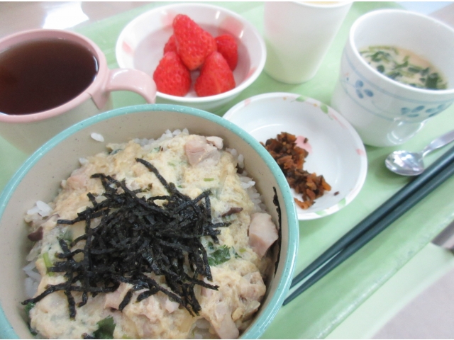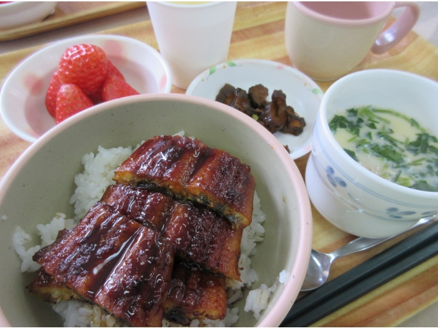 今月は、うな丼、茶わん蒸し、漬物、いちご、乾杯のリンゴジュースです。