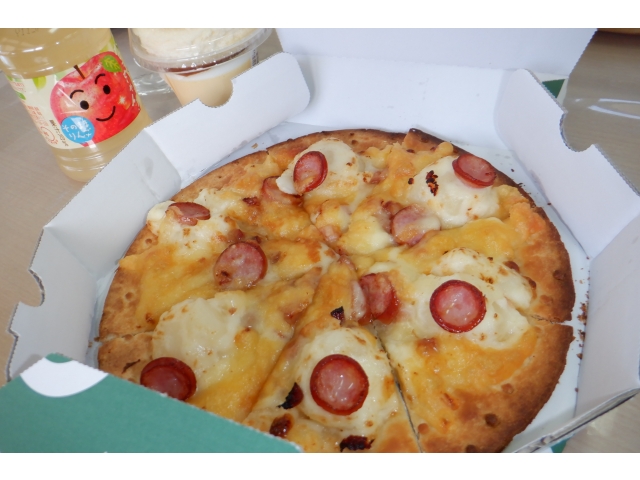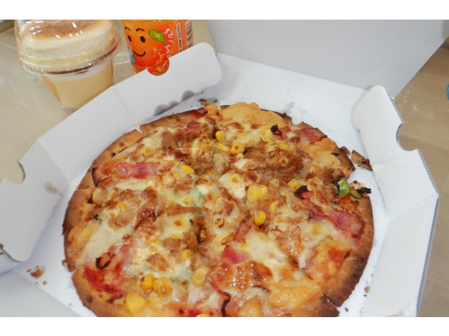 今回は、明知寮にほど近い宅配ピザ屋「ぴざどき」さんのピザと、ファミリーマートさんのスフレプリンのセットです🍕