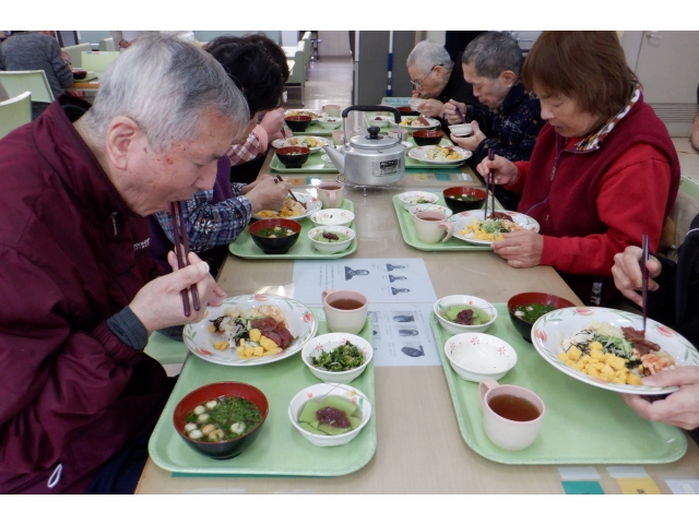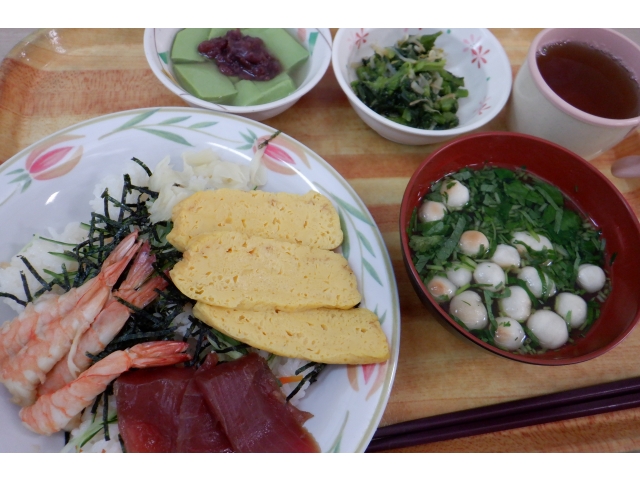 この日のメニューは、まぐろ・えび・玉子のちらし寿司、吸物、菜花の胡麻和え、抹茶ゼリー。