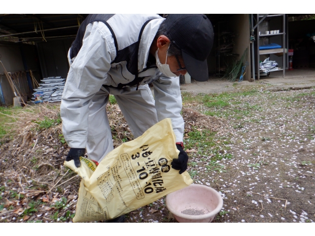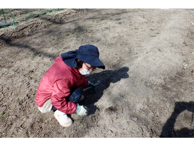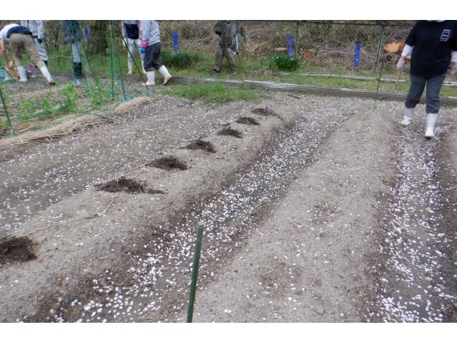 土作りとして、腐葉土、石灰、油かす、米ぬかなどを、それぞれうねに入れています。