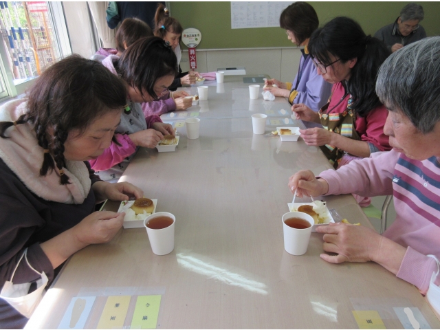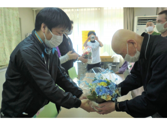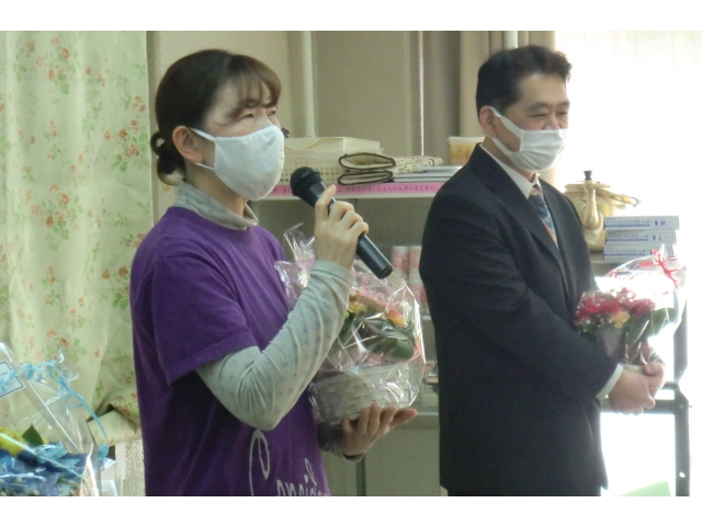 花束贈呈後、一人ずつご挨拶いただき、皆でプリンアラモードを会食しました。その後、それぞれ思い出話に花が咲き、別れを惜しんでいました。新天地でもお元気にがんばってください!