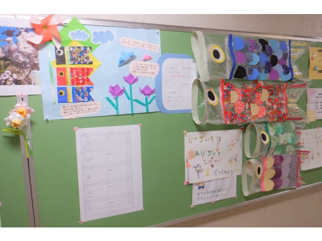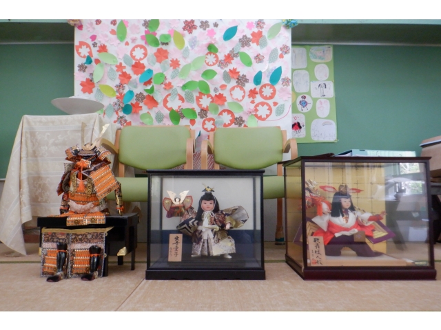 集会室には五月人形と、その後ろには文化クラブで作成した切り花も飾りました。