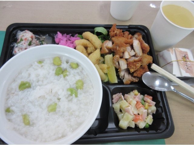 本日のメニューは、枝豆ご飯、鶏の唐揚げ、冬瓜のかにあんかけ、ポテトサラダ、漬物、りんごジュースです。