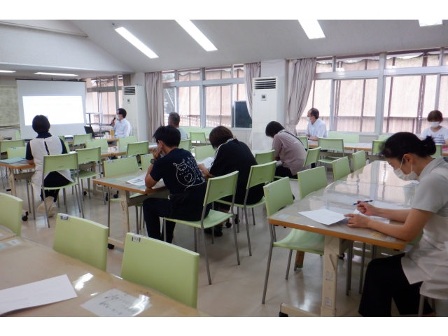 テーマは睡眠薬についてです。明知寮では、寝る前に薬を服用している利用者の方が多いので、皆、真剣に聞き入っています。薬の種類や作用時間など、とても勉強になりました。ありがとうございました。