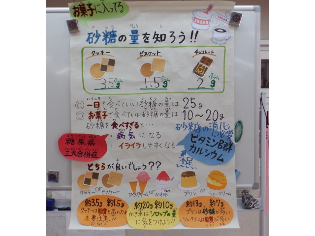 また、どのお菓子を選ぶと砂糖の量が少ないか、クイズ形式楽しく学ぶことが出来ました。