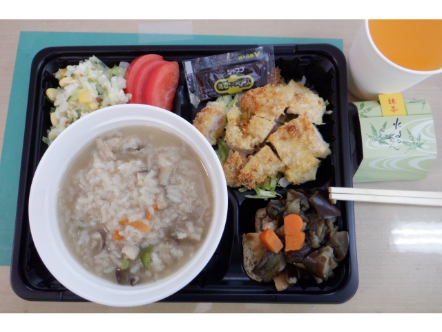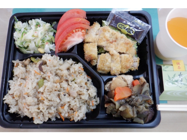 今月の献立は、きのこご飯、鶏肉のパン粉焼き、なすとがんもの煮物、コールスローサラダ、ようかん、オレンジジュースです。