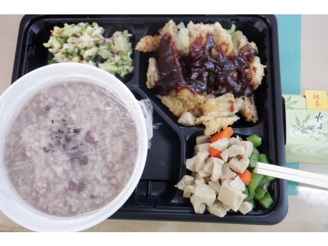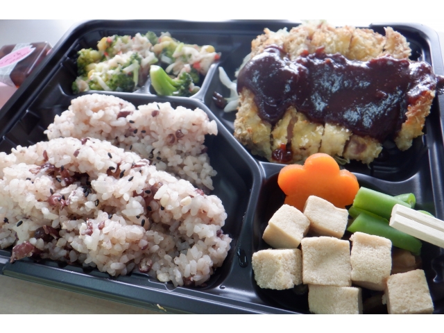 今月の誕生会のメニューは、赤飯、味噌カツ、高野豆腐の含め煮、ブロッコリーのツナ和え、ようかん、りんごジュースです。