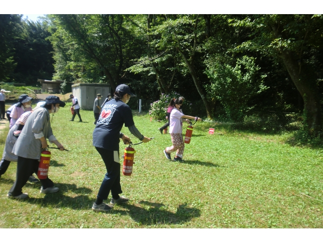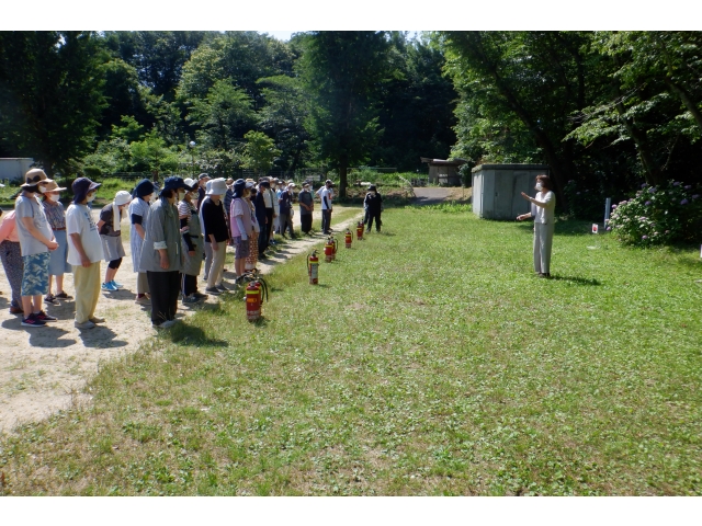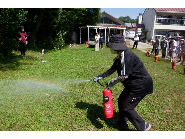 6月12日に、グラウンドにて防災訓練を実施しました。今回は水消火器による消火訓練です。 まずは次長から説明があり、その後職員が見本を見せました。