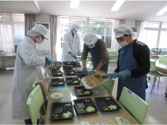 今月も厨房の方と、明知寮職員、栄養士実習生二人も一緒に心を込めて盛り付けしました!
