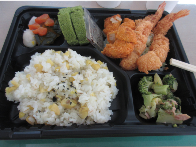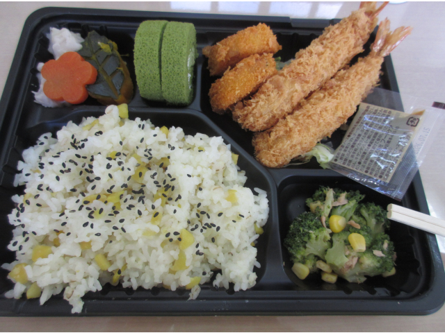 栗ご飯、エビフライ&ホタテフライ、炊き合わせ、ブロッコリーツナ和え、抹茶ロールケーキ、りんごジュース
