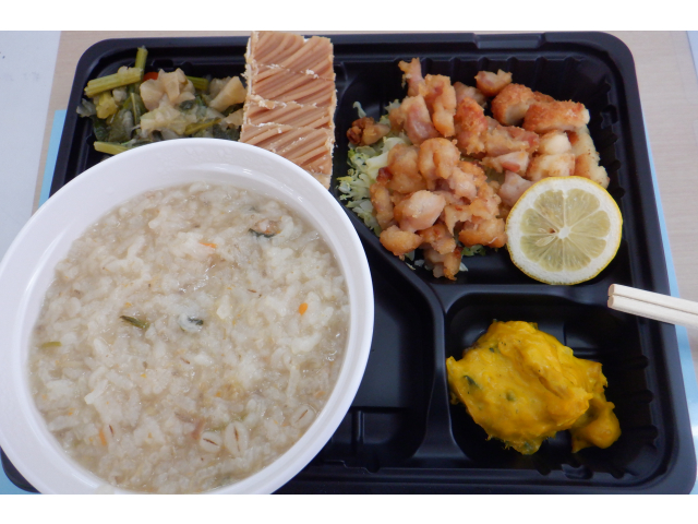 鶏ごぼう飯、唐揚げ&クリームコロッケ、かぶの煮つけ、かぼちゃサラダ、マロンケーキ、りんごジュース