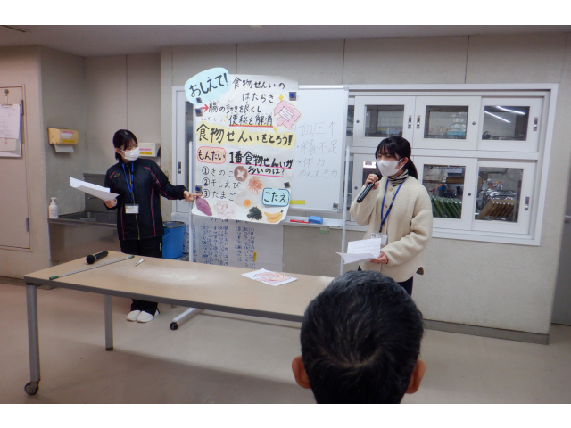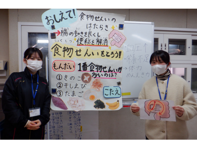 今回は便秘気味の時のマッサージの方法や、どんな食品に食物繊維がたくさん含まれているかをクイズ形式で学びました。