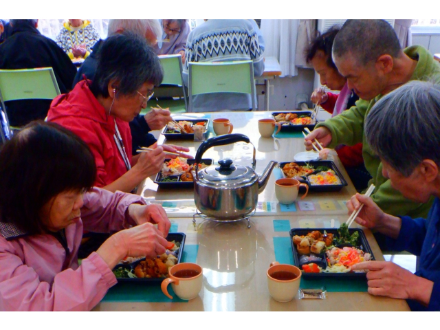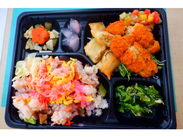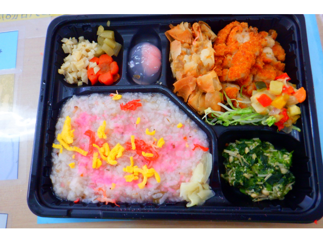 今年は桜の開花が早く、また前日に普降った雨の影響で散っている桜もある中でのお花見会でした。食堂から桜を眺め、春を感じながら、お花見弁当を楽しみました🌸 🍴お花見弁当🍴 桜ちらし寿司、桜エビ入りクリームコロッケ、筍とふきの煮物、菜の花のごま和え、くず饅頭(さくら)
