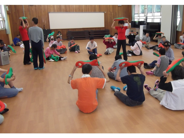 毎月1回、第1木曜日に「社団法人日本3B体操協会愛知県支部岡崎グループ」の皆さんが来てくださり、3B体操を行っています。 3B体操とは、ボール、ベル、ベルターの用具を運動の助けとして使用しながら、全ての動きを音楽に合わせて集団で行う健康体操です。 藤川の里では、主にベルを使ってリズムに合わせて皆さん楽しく体操を行っています。