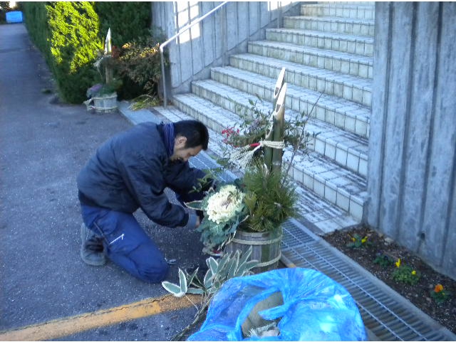 愛厚藤川の里西隣は、当施設と同じような障害者施設の藤花荘・第二藤花荘・サンワーク藤川の三施設があります。 毎年、この年末になりますと、サンワーク藤川では、職員と利用者が協力して多くの門松を製作し販売します。 日頃、交流が深い当施設には無料で門松を設置して頂いております。 たいへんありがたく、心から感謝しております。