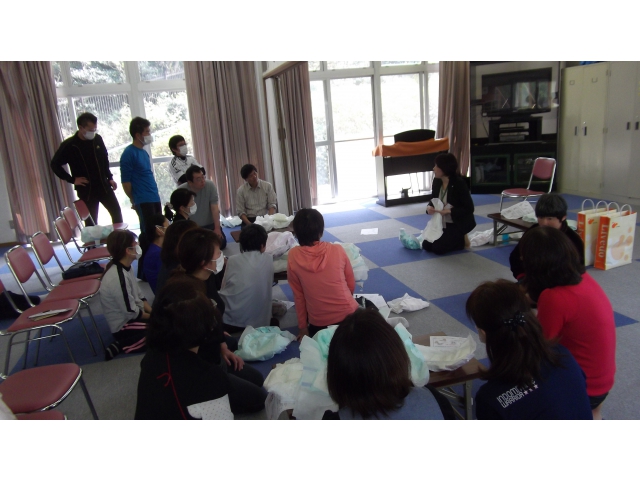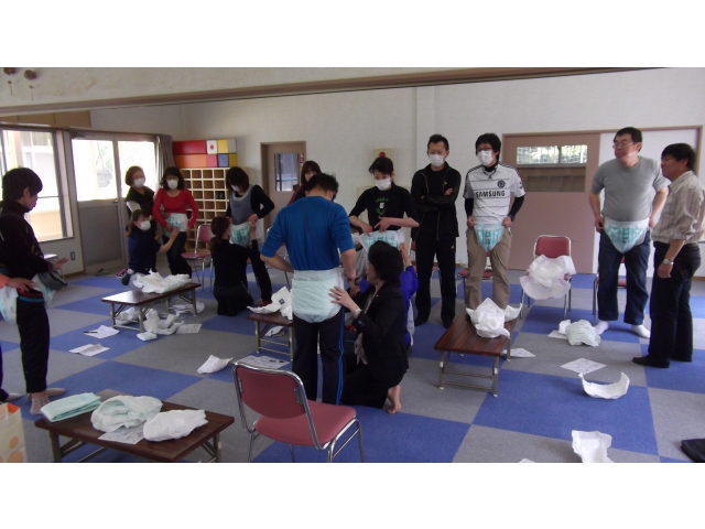 4月18日(木)に(株)リブドゥコーポレーションから講師の方に来ていただきおむつ講習会を実施しました。 新規採用職員や転入職員者を主に対象者とし、またこれまで勤めている職員も振り返りを含め参加しました。 おむつのあて方などパートナーを組み、あててみると今までのやり方と先生に教わったやり方とでは、フィット感がぜんぜん違いました。 おむつやパットの構造を活かした広げ方もあり、新しく色々なことが勉強になりました。