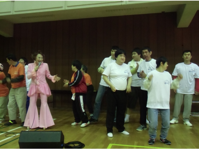 その後、同志社大学の学生さんによるストレッチ運動や「じゃんけん体操」というレクリエーションを行いました。「スポーツ健康科学部」の学生さんらしい、よく研究されていて取り組みやすい内容でした。藤川の里でも実践していきたい内容でした。閉会後も実行委員の皆様に見送られ、一人ひとりに握手していく方もいました。たいへん手厚いおもてなしで利用者様も職員も大満足な催しでした。