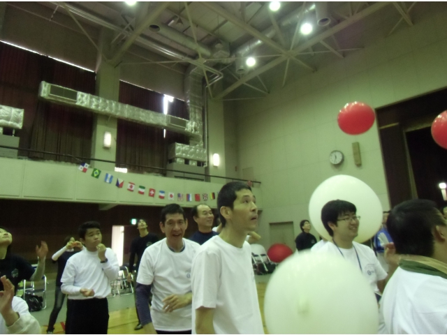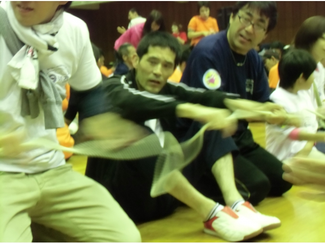 「ロープ送り」と「大玉ころがし」「風船バレー」の三種目で争いました。日頃の運動の時間では見ることのない大きな大玉や風船に少し戸惑いながらも、同行の職員や他施設からの参加者や実行委員の姿を真似て、力いっぱいに大玉や風船を投げて、叩いていました。やはり、大きいものを力いっぱいに叩くのはストレスも発散されてスッキリした様子でした。