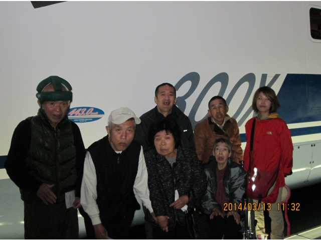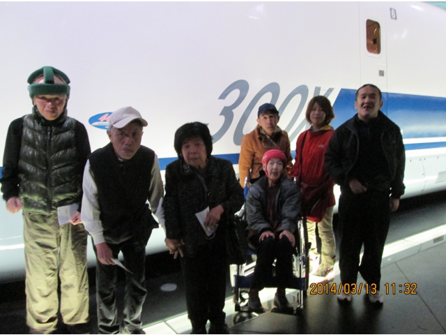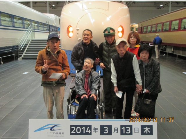 3月13日(木)わくわく外出でリニア鉄道館へ行きました。到着後、新幹線の車両前で記念撮影をしました。その後、車両展示場では、新幹線の食堂車内を観たり、名古屋駅を中心にしたジオラマを観ました。
