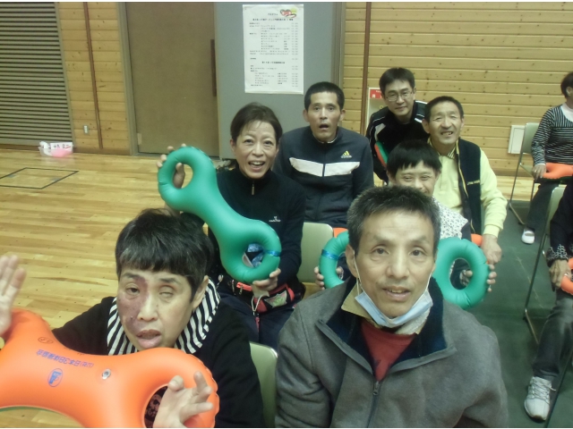 会員様の圧倒されそうなエクササイズのパフォーマンスには利用者の皆様も職員も自然と拍手を送っていました。そのあとは実際にベルを持って、北島三郎の名曲「まつり」に合わせてストレッチやシェイプアップのエクササイズに挑戦しました。