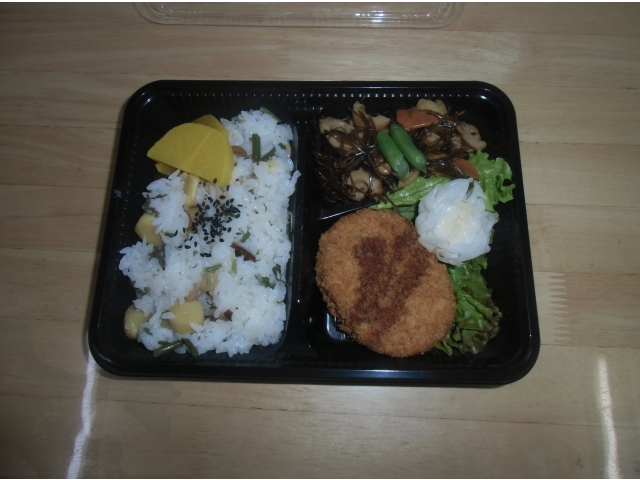 メニューは…栗ごはん、カボチャコロッケ、豆腐焼売、大豆の糸昆布煮。