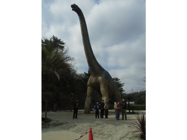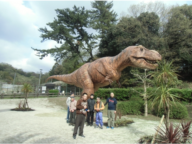 - 迫力満点の恐竜の前で記念撮影。