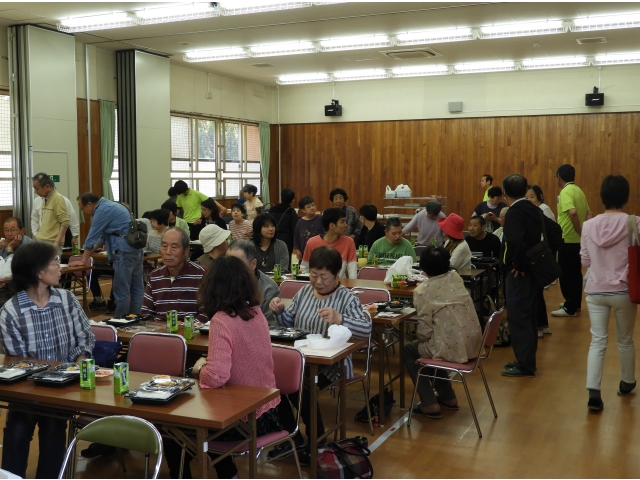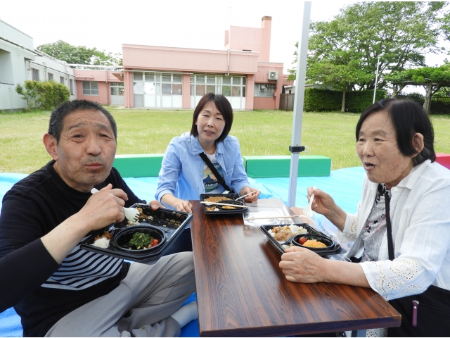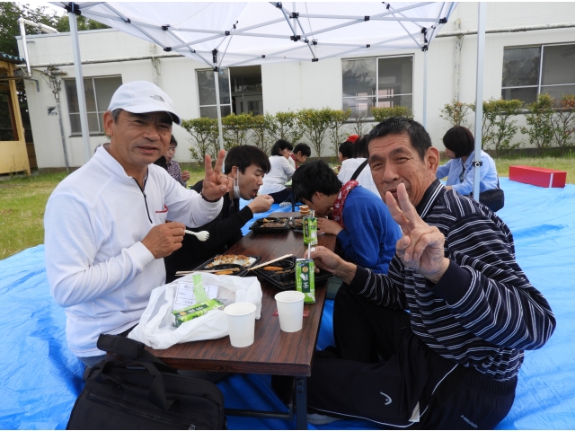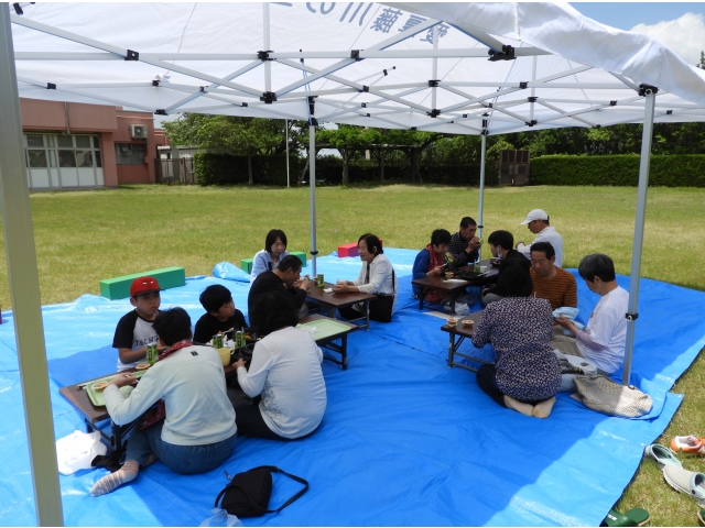 普段と違った雰囲気の中、グラウンドに設置したテントの下で食べられた方も見えました。