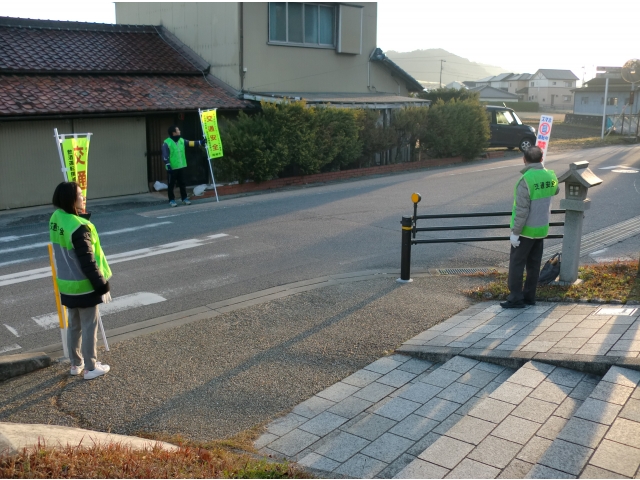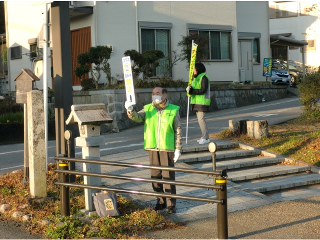 藤川の里の通りは、国道1号線から脇に入った道なためなのか、細い街道にも関わらず交通量が多く、スピードを出す車も多くいます。地域住民や学生さん等、多くの方が使われる道なので交通事故の無いように旗やカードを持って安全運転の啓発活動を行いました。