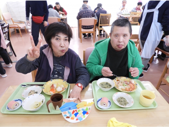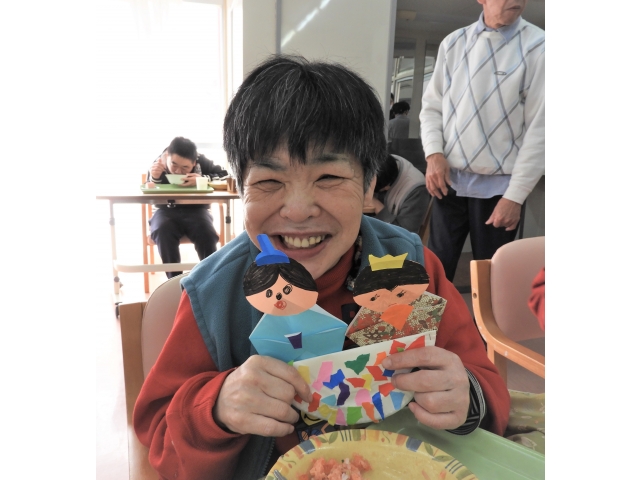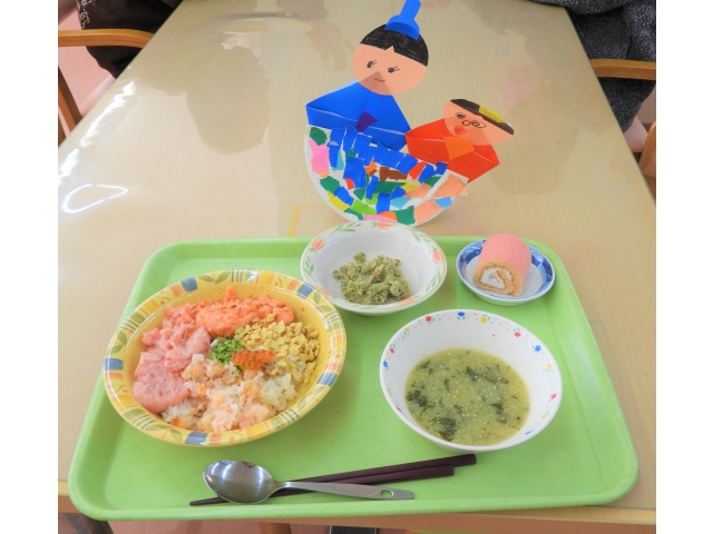 ひな祭り会食は、手まり寿司・ちらし寿司・豆腐と白菜のスープ・ほうれん草卯の花ゆず風味・彩りロールいちごミルク・ジュースでした!! とてもおいしかったようで、おかわりをする方がたくさん見えました。また、とても素敵な笑顔がいっぱい見ることができ、楽しんでもらえたようでした☆