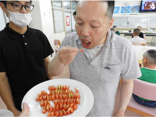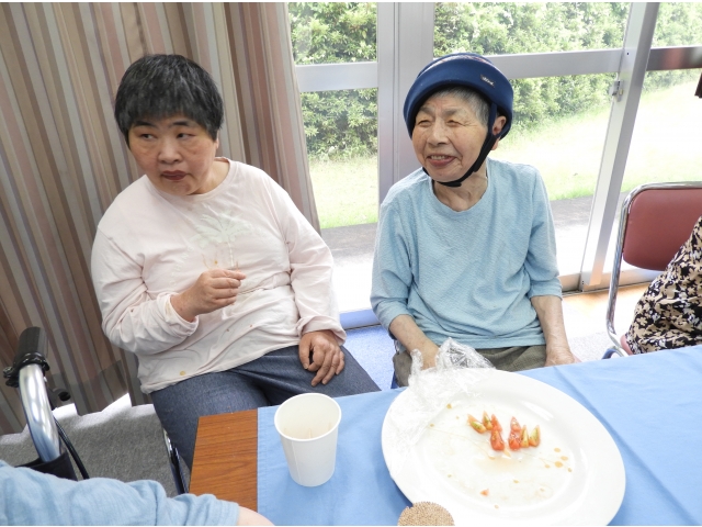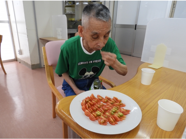 一口ずつではありますが、利用者の皆さんと協力して作ったミニトマトを食していただくことができました。「美味しいよ」と言っていただける方もいれば、無言で何個も食べようとする方も見えて、皆さんそれぞれ気持ちの表現方法は様々ですが、利用者さんの笑顔に繋がる活動をこれからも行っていきたいと思います。