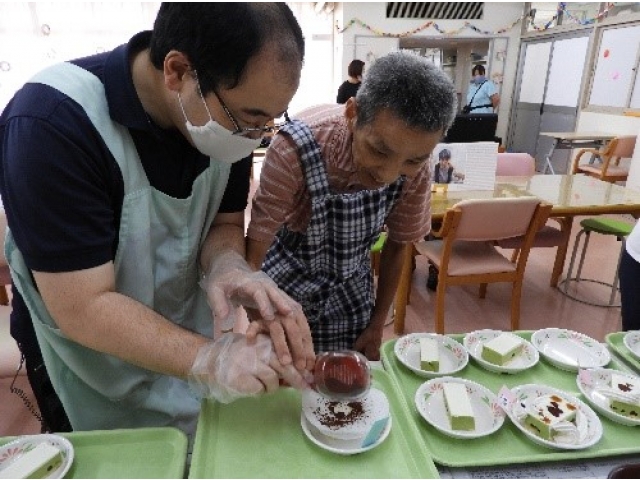 午後からはいつものクッキングクラブを拡大し、利用者様にお手伝いいただいて抹茶ムースケーキにトッピング等盛り付けてもらいました。ココア・抹茶パウダーで星型・ハート・ネコのステンシルを使って模様付けしてさらにホイップクリーム・黒蜜・きな粉で思い思いの盛り付けをしていただきました。なかには、遠慮なく大量の盛り付けをする方も…!
