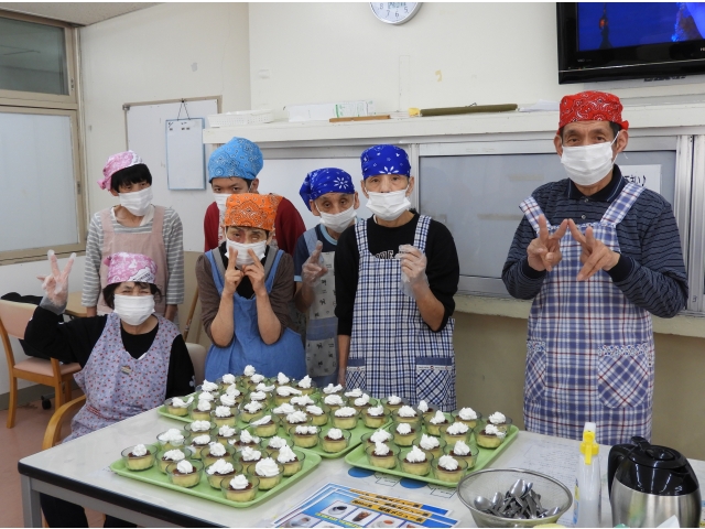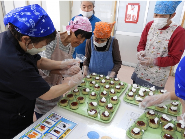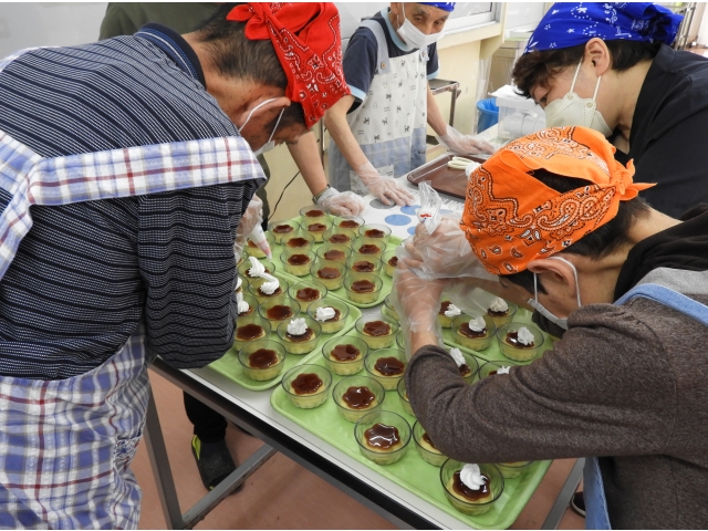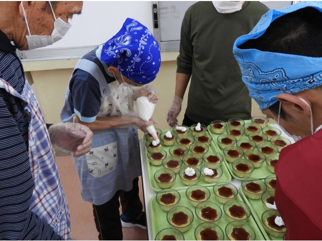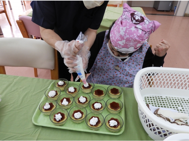 4月のクッキングクラブは、プリンに生クリームでデコレーションです。利用者の皆さんとても上手に生クリームを塗ることができました!!
