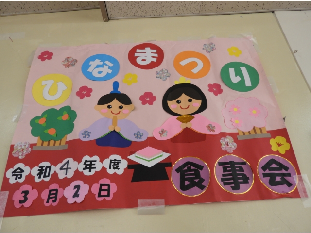 3月2日(木)、「ひな祭り会」を実施しました。食事の前には利用者の方々と職員で一緒に「うれしいひな祭り」を歌い、ひな祭りの雰囲気を感じることができました。