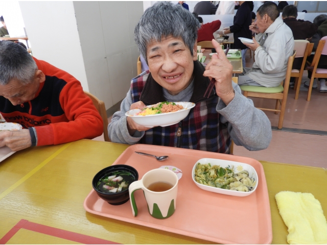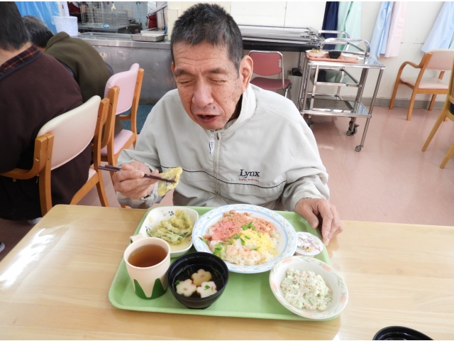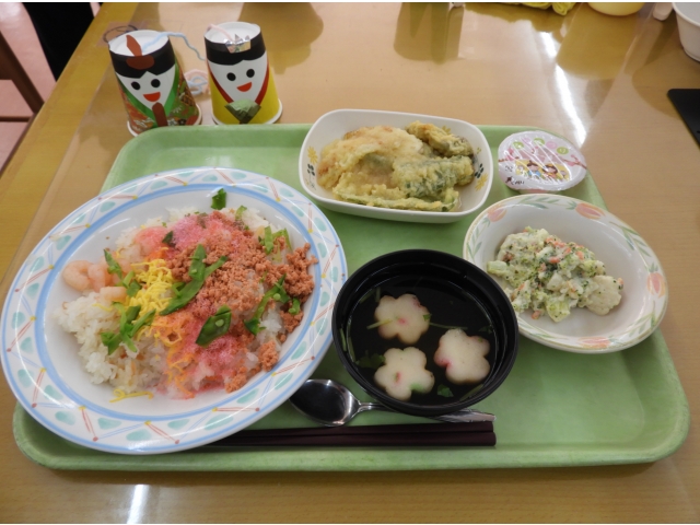 昼食は「ひな祭り」の由来でもある健やかな成長と幸せを願い、縁起物の食事を用意しました。食事の内容は、ちらし寿司・天ぷら・和え物・汁物・デザートで、普段とは違った季節の行事食を味わって楽しみました。