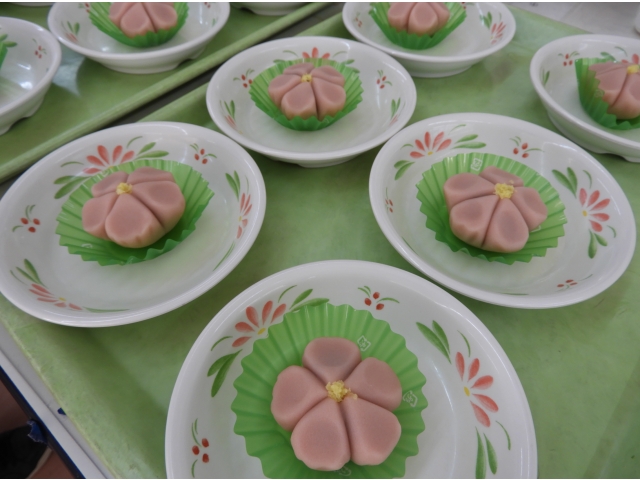 午後は「ひな祭り」にちなんだ花形の練りきりと、好きなジュースを選んで飲食されました。