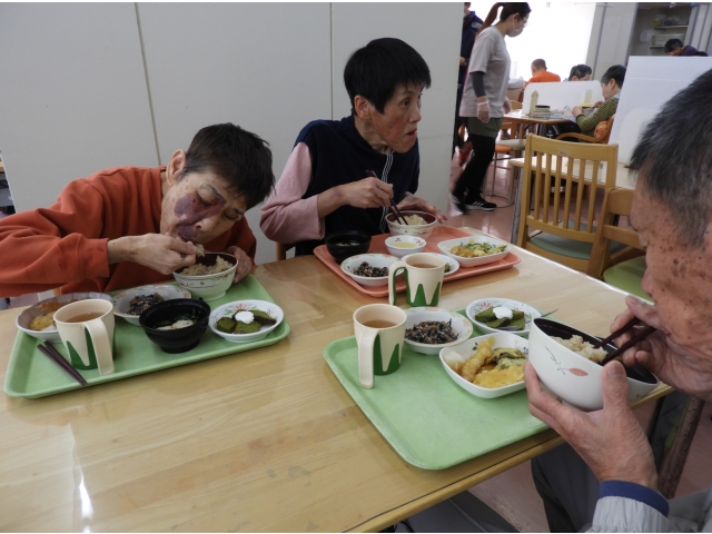5月2日(火曜日)に端午の節句食事会があり食堂で行事食を沢山食べました。食堂内には利用者様が塗った塗り絵や鯉の飾りがたくさん飾られており楽しい時間を過ごせました。