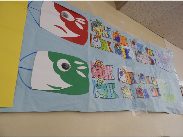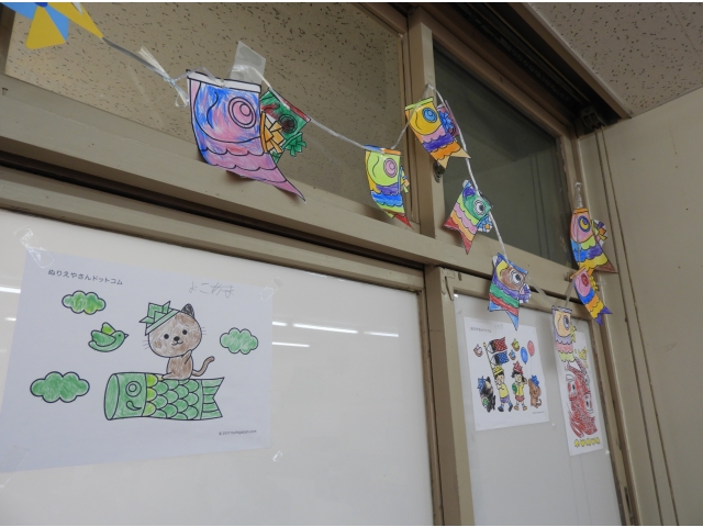 利用者様が塗ったり切ったりして一生懸命作った鯉を1年間健康で元気に過ごせるように願いを込めて食堂内に飾りました。