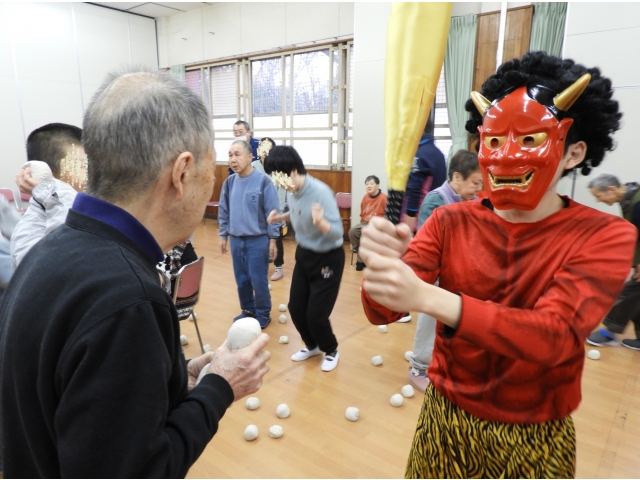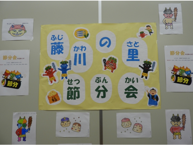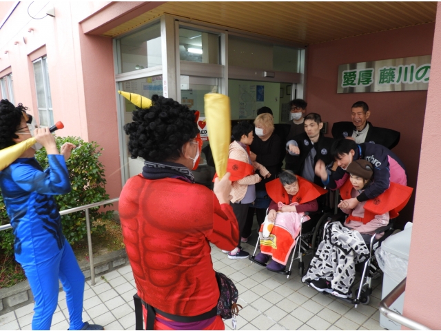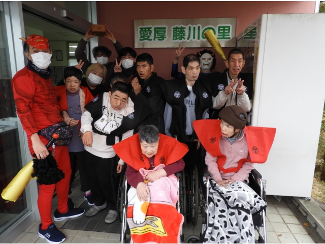 令和6年2月5日(月)に藤川の里で節分会を行いました。「鬼は外、福は内」の声掛けで利用者の皆様は力強く鬼に向かって豆(代用:玉入れの玉)を楽しそうに投げていました。また、職員も共に利用者の皆様が一年間健康に過ごせるよう想いを込め行事に参加しました。