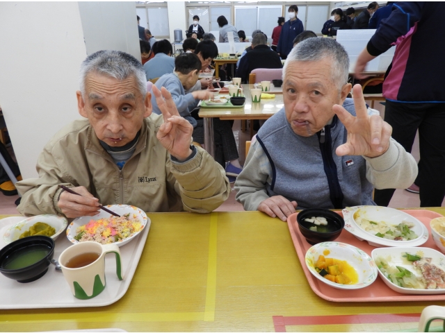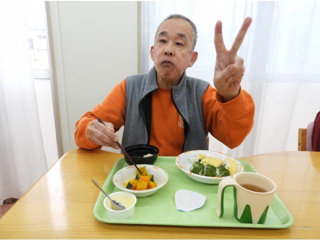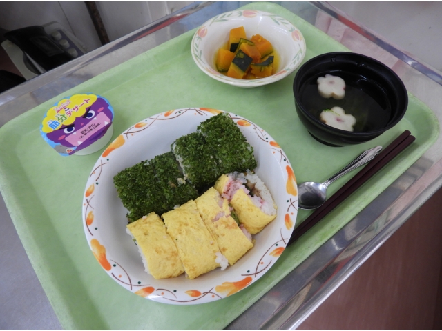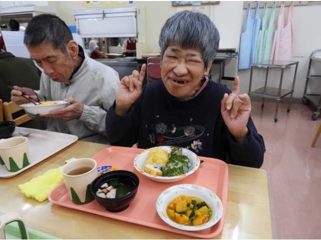 昼食では、恵方巻・かぼちゃの煮物・お吸い物・デザートを食べました。恵方巻を食べるのが難しい方は、ちらし寿司・雑炊を食べ楽しい時間を過ごせたと思います。