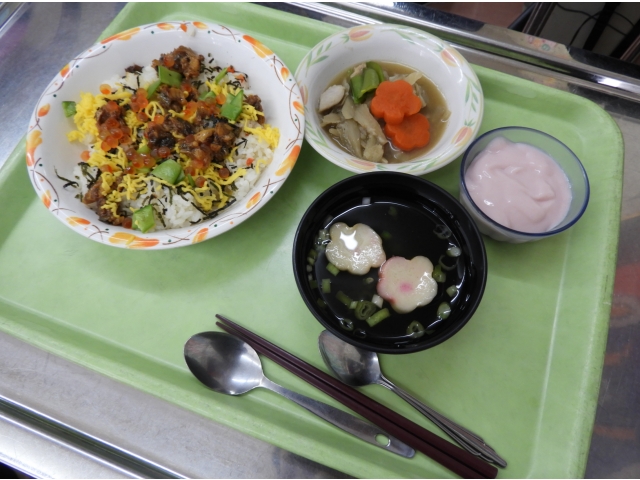 今日のメニューは「あなごちらし・すまし汁・筑前煮・デザートムース」