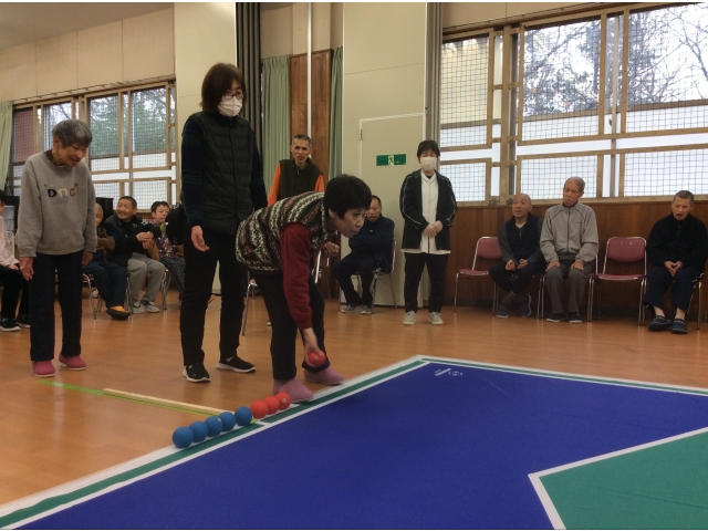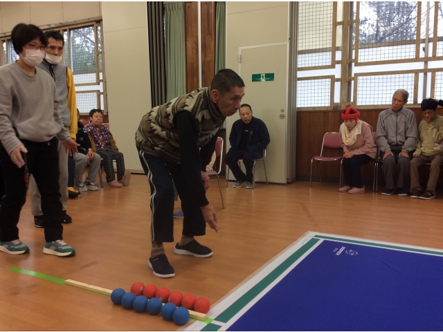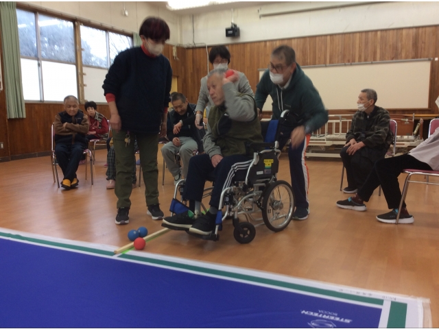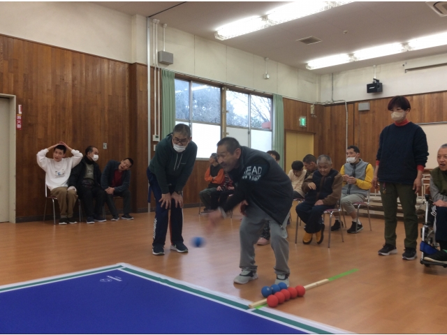 3月5日(水)施設内でボッチャの大会を行いました。9月に行われた藤川の里フライングディスク大会では個人戦でしたが、今回のボッチャ大会では1チーム3人でのチーム戦として行い、合計で12名の利用者様が参加されました。大会前にはボッチャの練習を行っており、試合では優勝を目指して頑張る姿がみられました。
