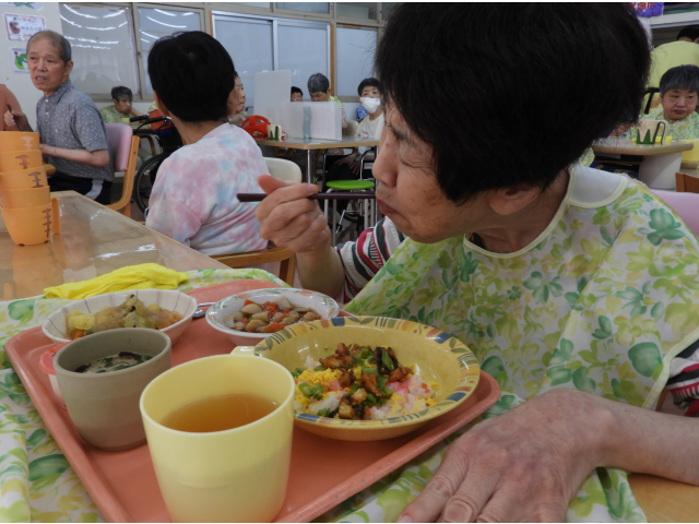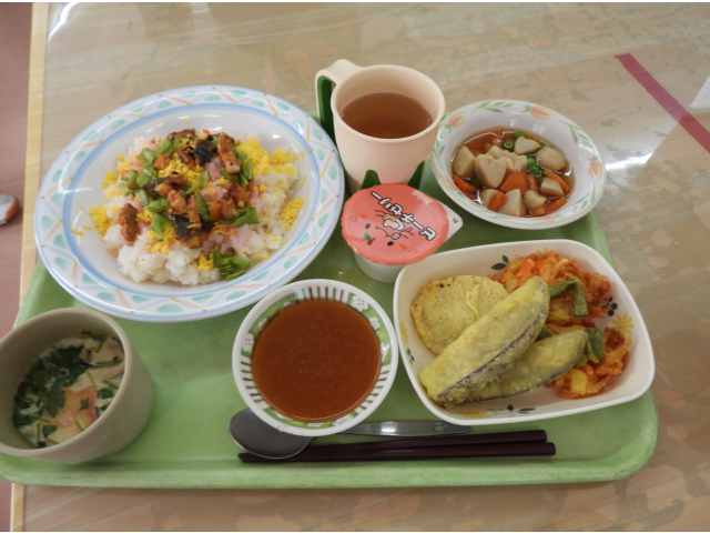 昼食は美味しいお祝いの行事食がでました。メニューは「穴子のちらし寿司、てんぷらの盛り合わせ、里芋の煮物、桃ゼリー」と盛りだくさんで利用者様方も美味しそうに食事を味わっておりました。