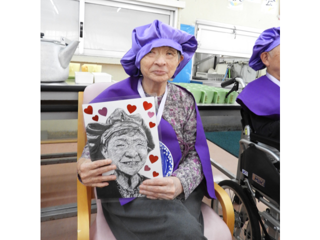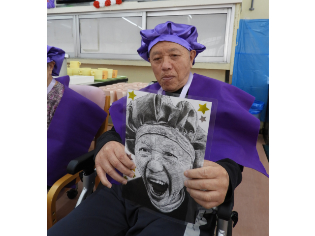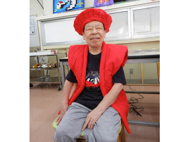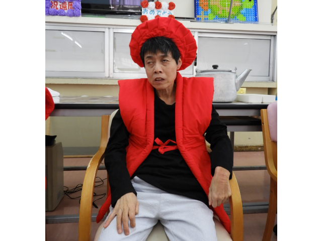 午後は敬老会とお祝いのケーキです。今年60歳(還暦)と70歳(古希)になられた4名の利用者様はちゃんちゃんこや頭巾を被り、お祝いをさせていただきました。皆様から拍手でお祝いをされると、笑顔で嬉しそうな表情をされていました。