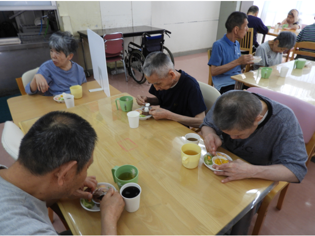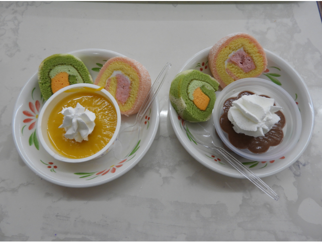 長寿の方へのお祝いが終わり、最後にお祝いとしてロールケーキとジュースを提供しました。ロールケーキはいちごやメロン味の2種類に加えて、かぼちゃプリンかチョコムースどちらかを選んで食べていただき、皆様すぐにペロリと召し上がられていました。
