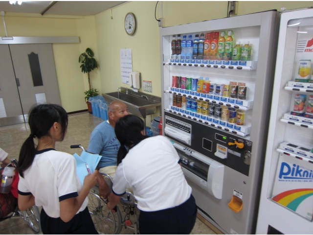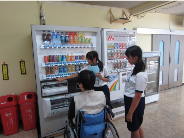 その後には、ある利用者さんがジュースを購入するために自販機の前にいたところに居合わせ、生徒さんがジュースを買うのを手伝ってあげると、近くにいた他の利用者さんからも