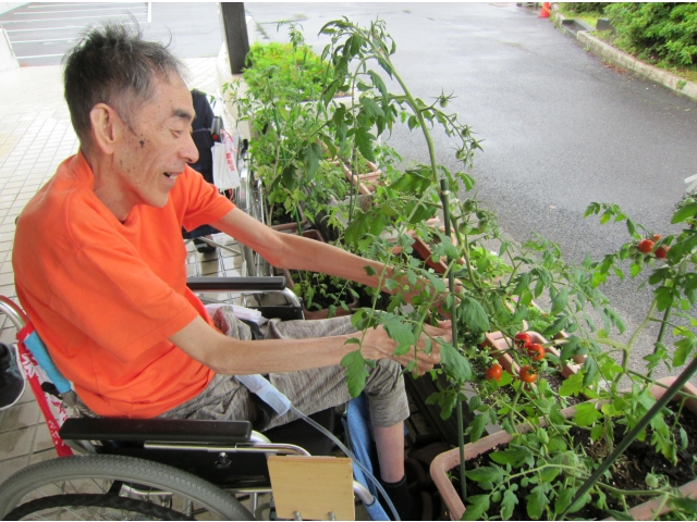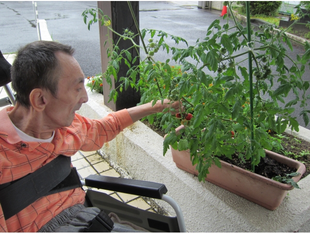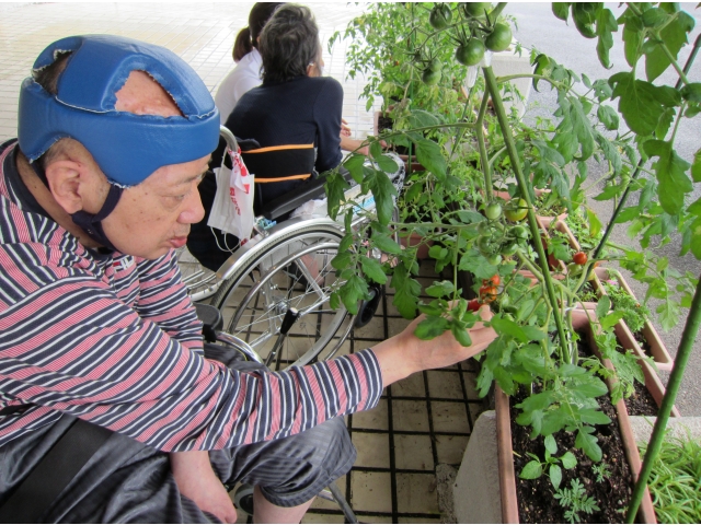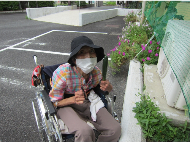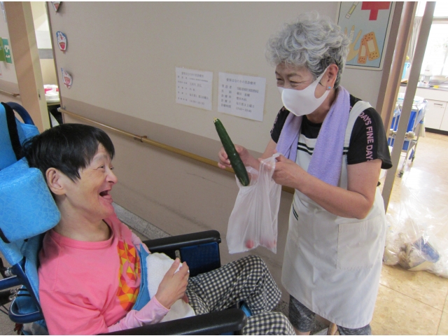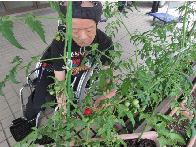 グリーンカーテンのきゅうりと玄関先のミニトマトがすくすく成長し、収穫できるようになりました! 『いきものがかり』の活動の合間に収穫のお手伝いをしてもらいました。